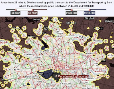 Estos modelos se pueden emplear para elaborar mapas tan interesantes como este mapa de calor de Londres donde se muestran aquellas zonas en las que buscar una vivienda para comprar o alquilarla, en función del coste y tiempo empleado para llegar al trabajo.