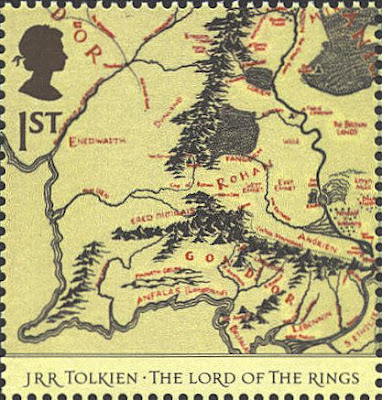 On February 26, 2004 Great Britain issued 10 stamps to mark the 50th anniversary of the publication of The Lord of the Rings. The designs incorporated drawings by J.R.R. Tolkien. The first of the series is a map, drawn by his son, Christopher and printed in 1954 in The Fellowship of the Ring.