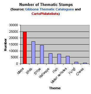 Woesner ha realizado un estudio sobre el número de los mapas que aparecen en los sellos temáticos, a partir del catalogo Gibbons.